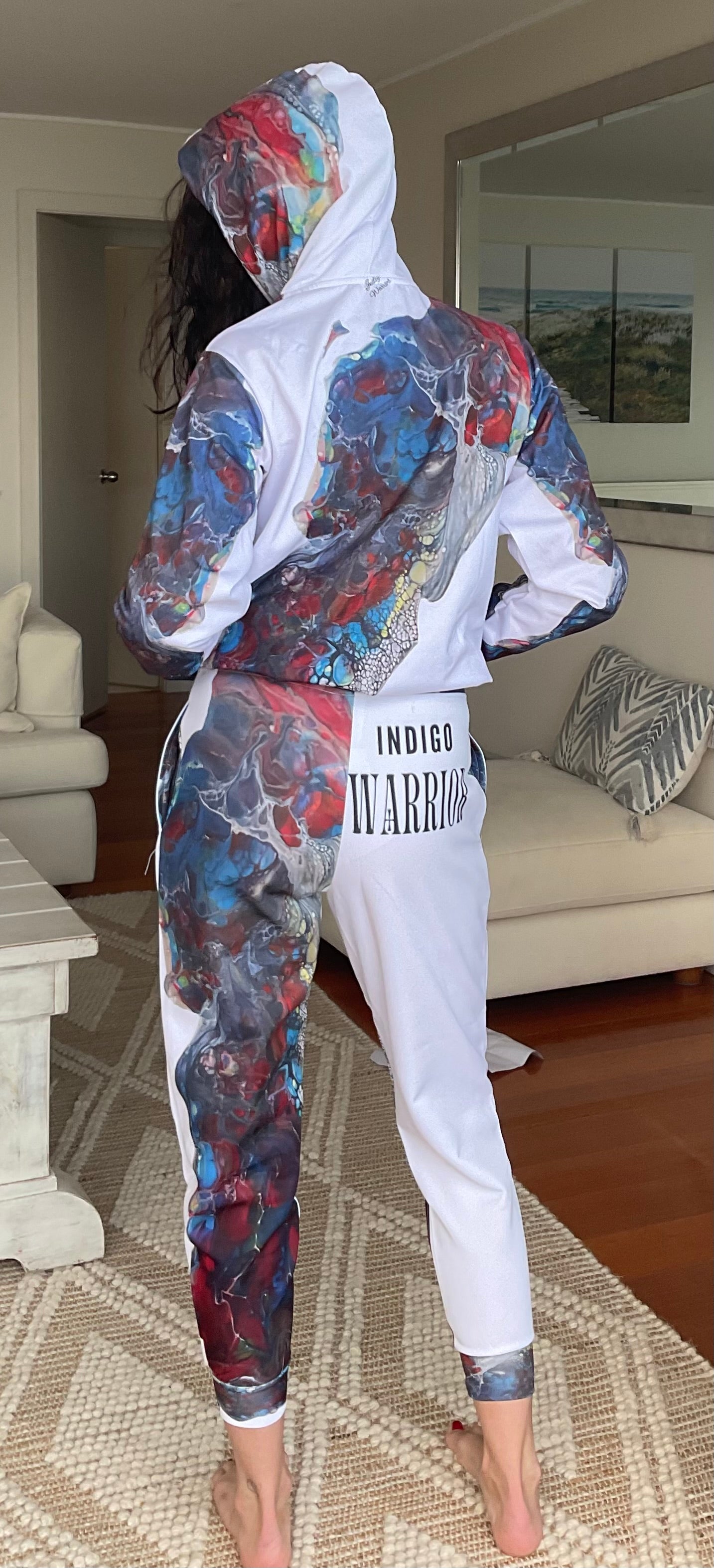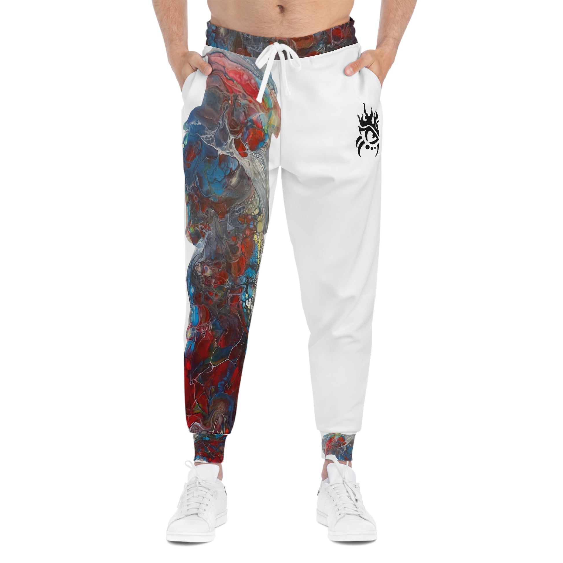 Indigo warrior athletic track pants with fluid art print and tattoo art are a perfect match with indigo warrior hoodie, making for a cool tracksuit. These joggers give off a stylish and comfortable vibe, perfect for casual wear or exercise. Ideal for those who love unique and artsy activewear. Relevant for holidays such as Halloween or Comic-Con.