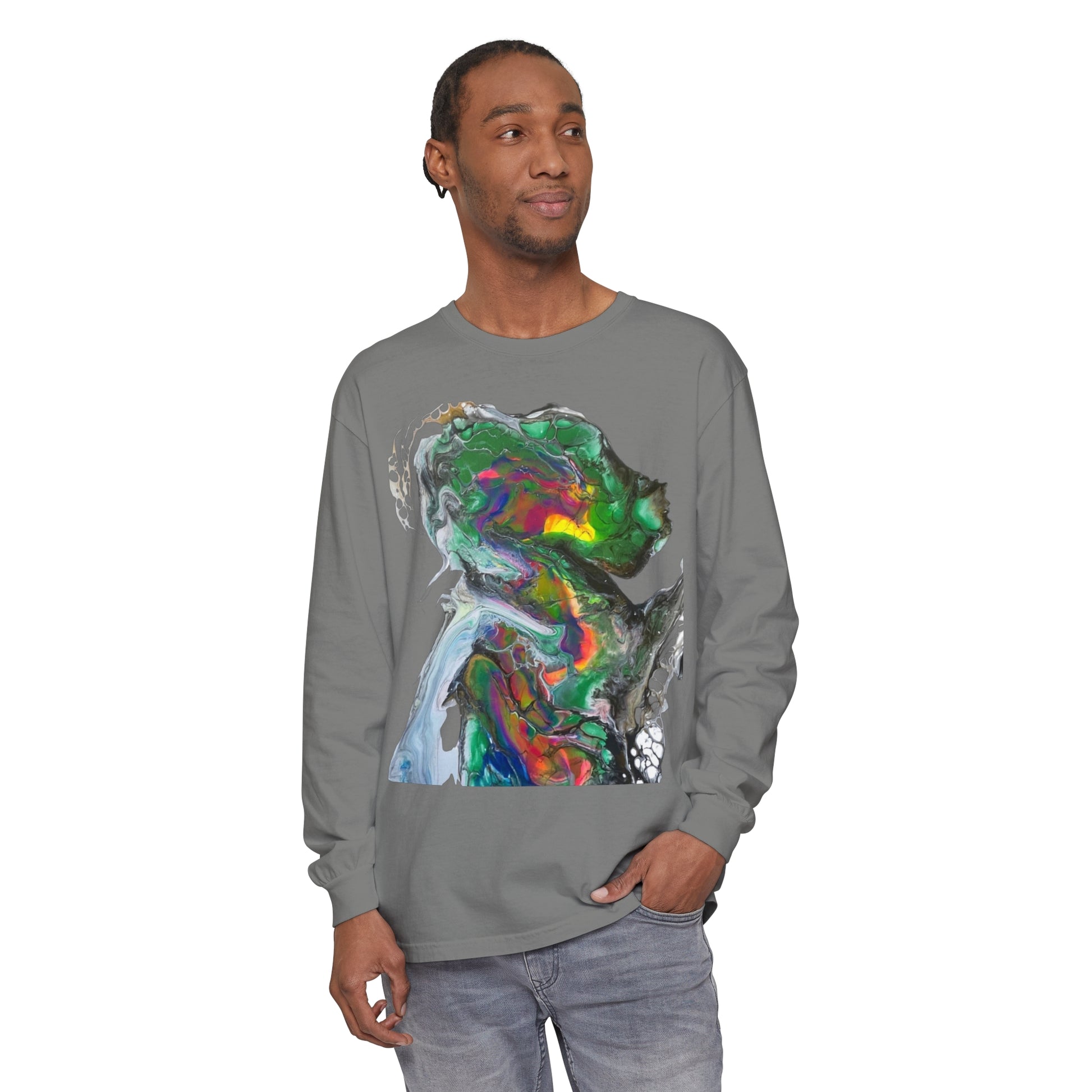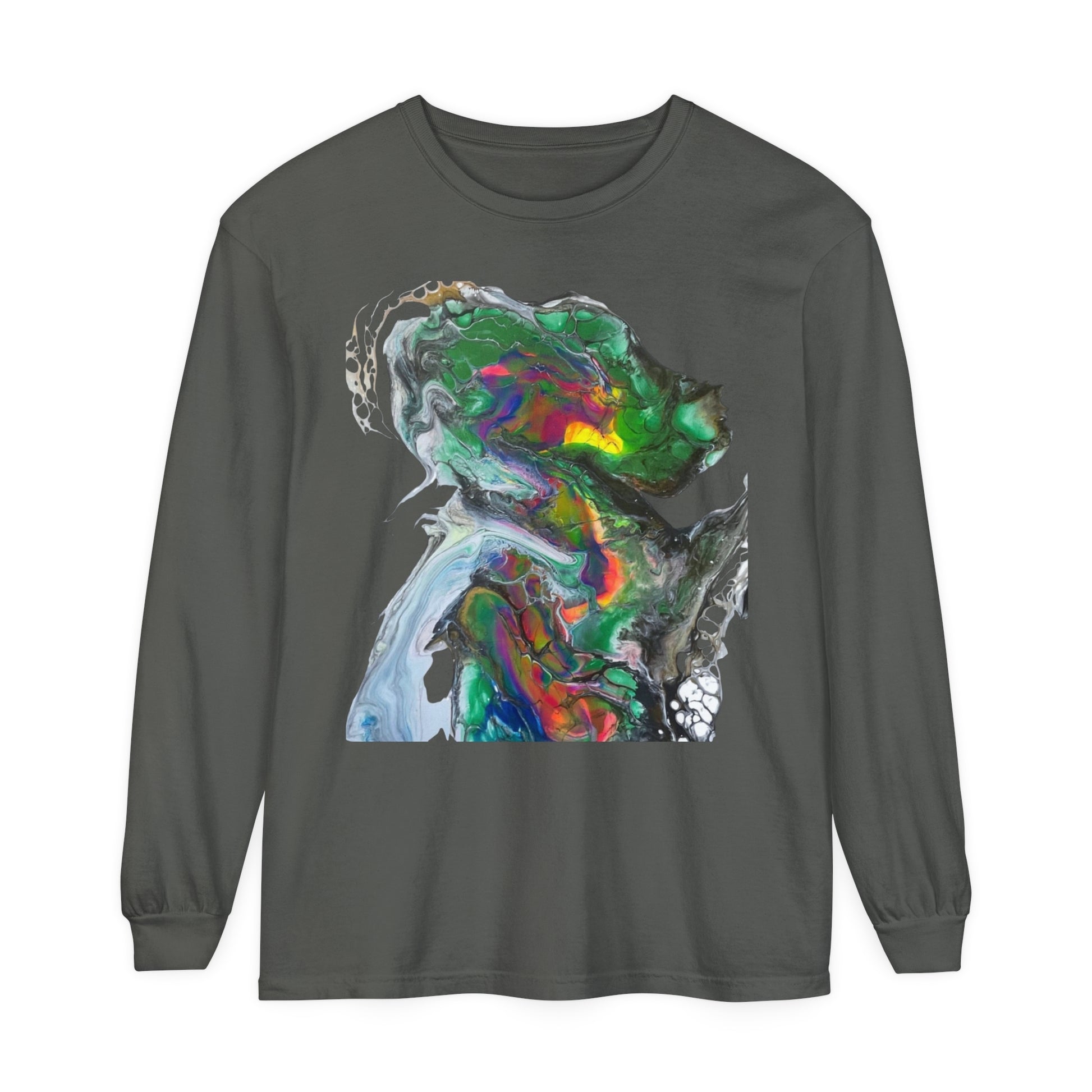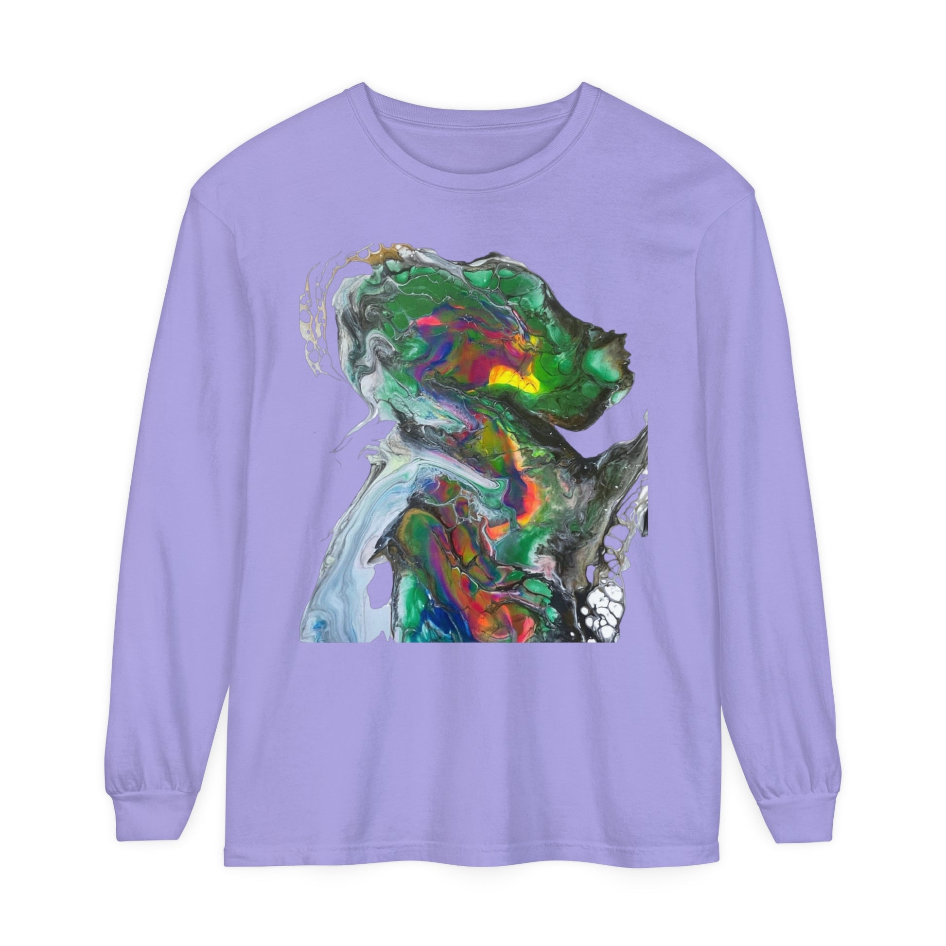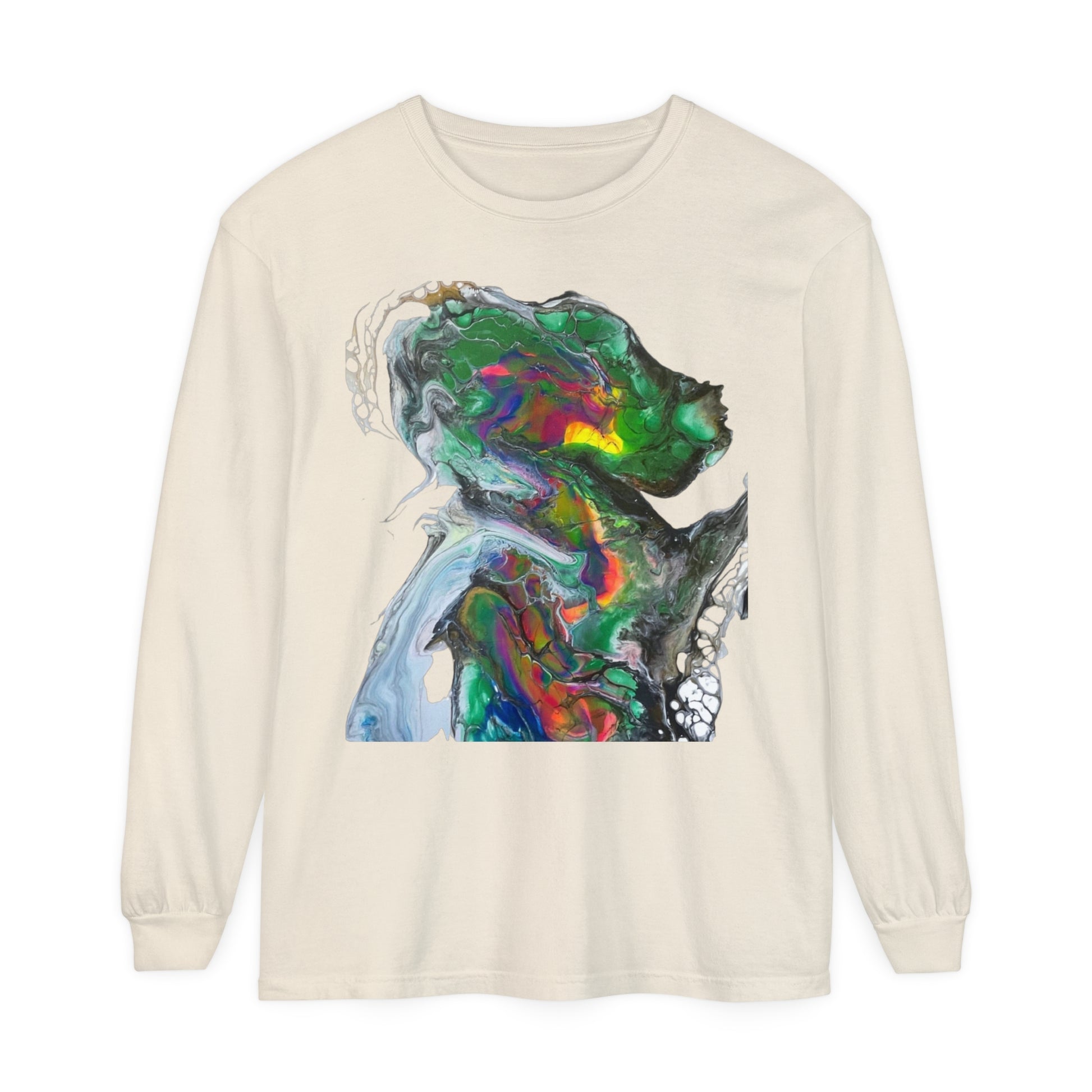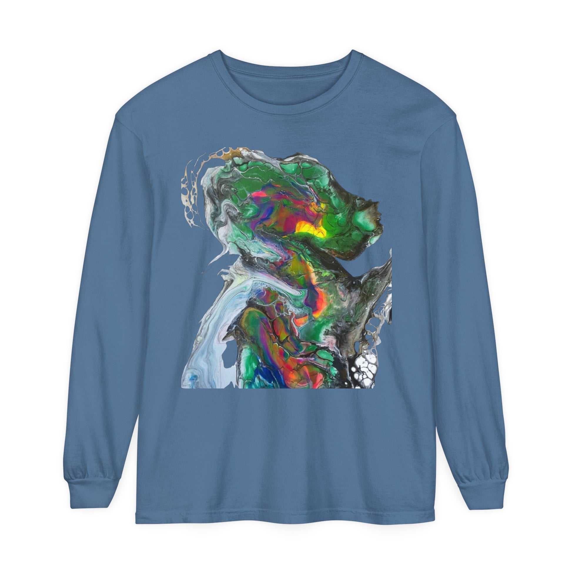 Indigo warrior ‘Green alien Warrior’ fluid art long sleeve t-shirt that gives off a bold and unique vibe. Perfect for those who love creative and distinctive designs. Ideal for casual wear or as a statement piece during art events or festivals.