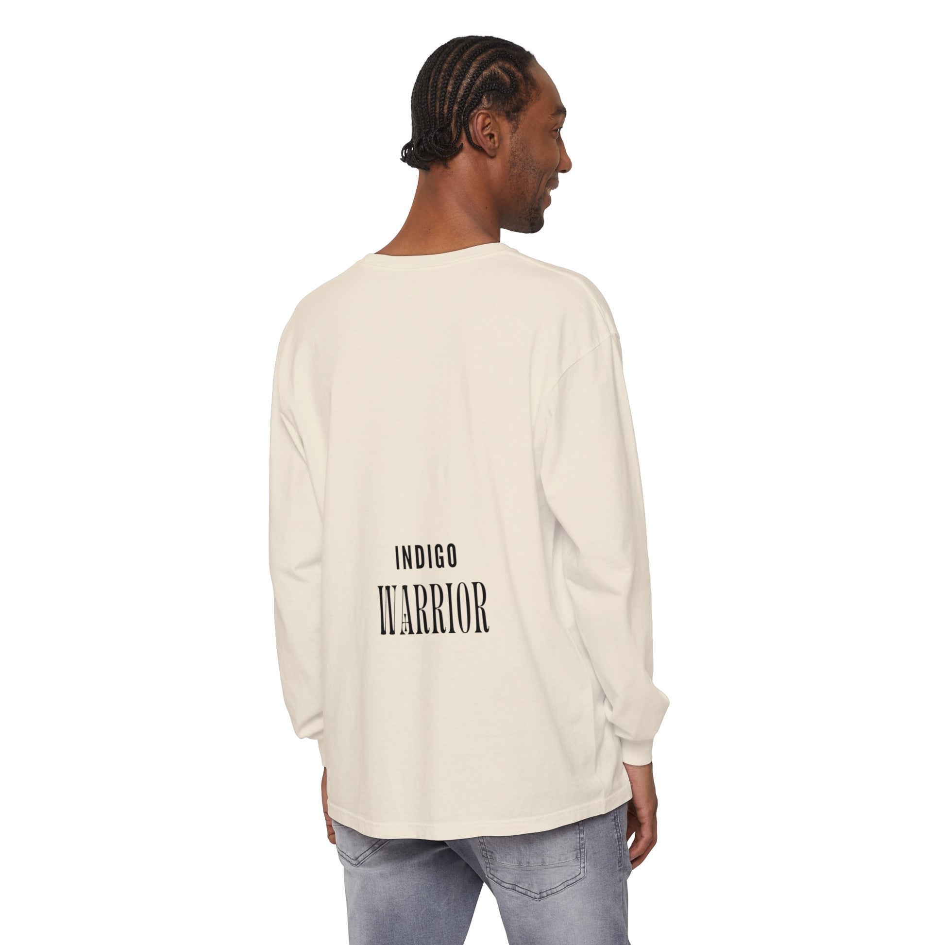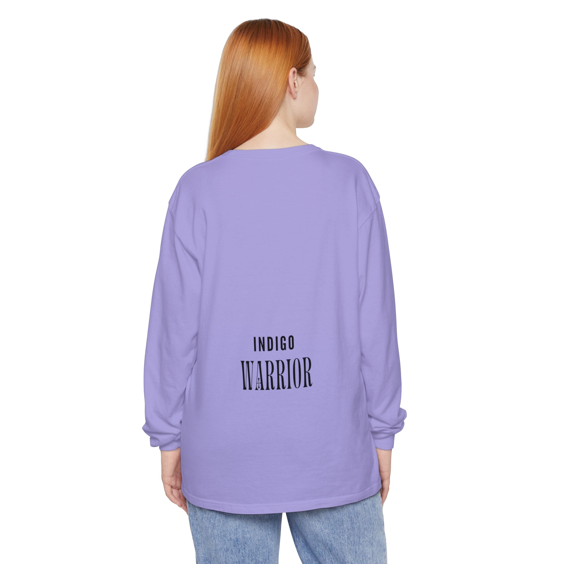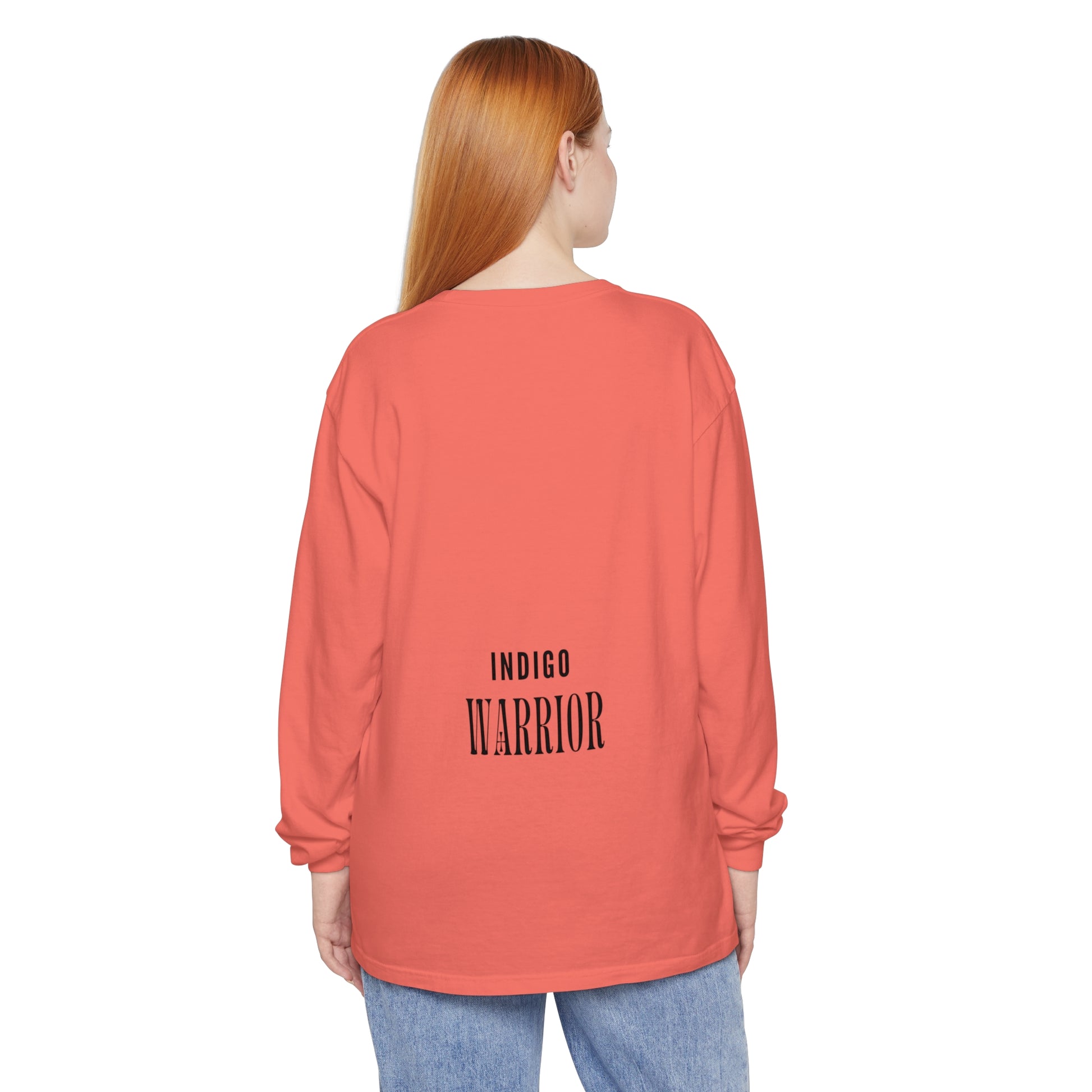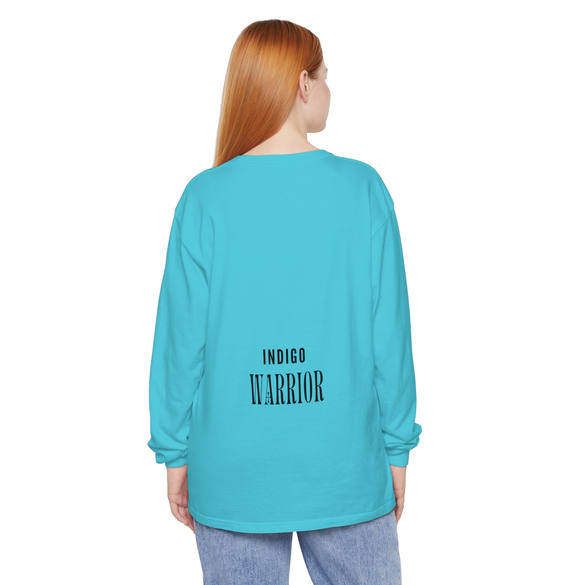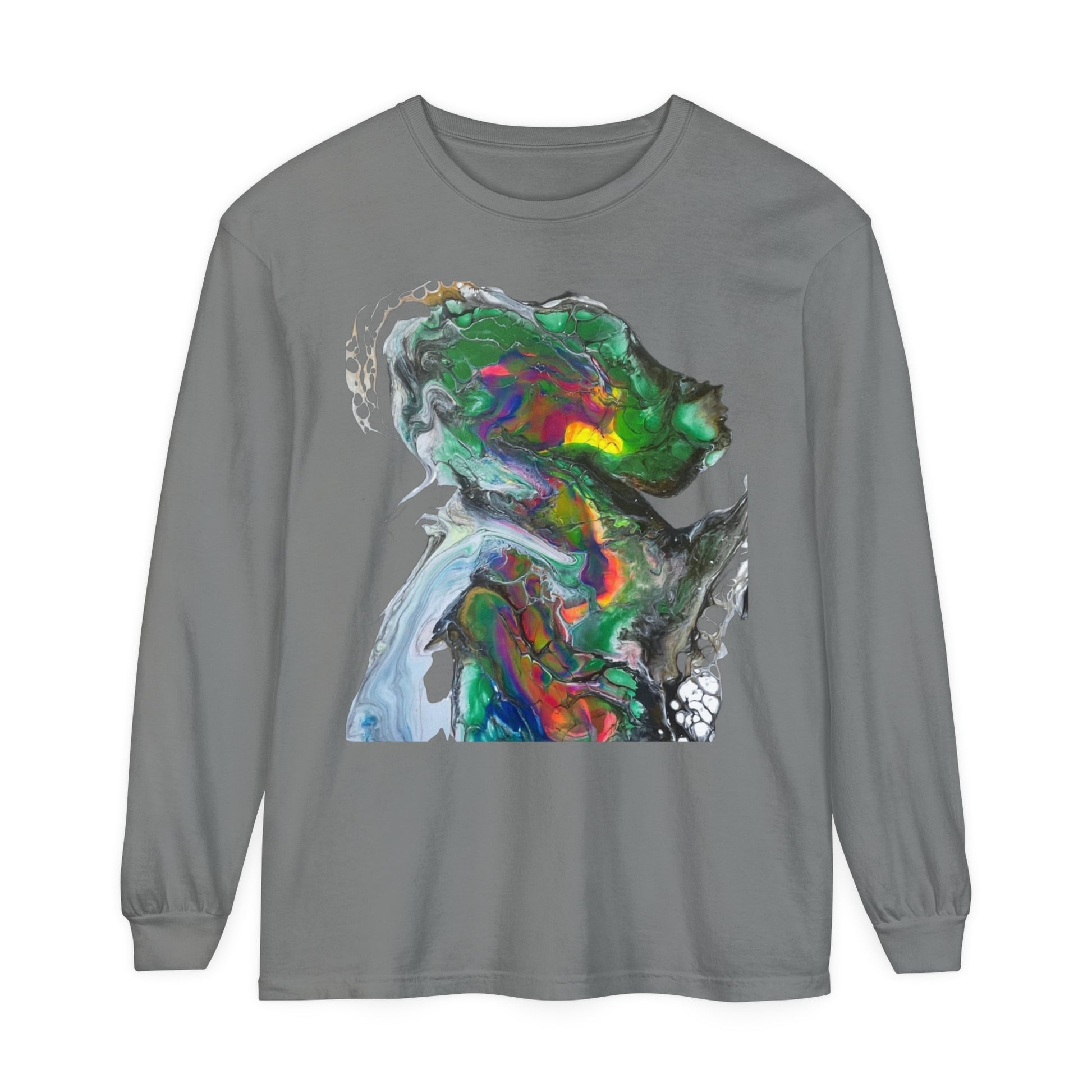 Indigo warrior ‘Green alien Warrior’ fluid art long sleeve t-shirt that gives off a bold and unique vibe. Perfect for those who love creative and distinctive designs. Ideal for casual wear or as a statement piece during art events or festivals.