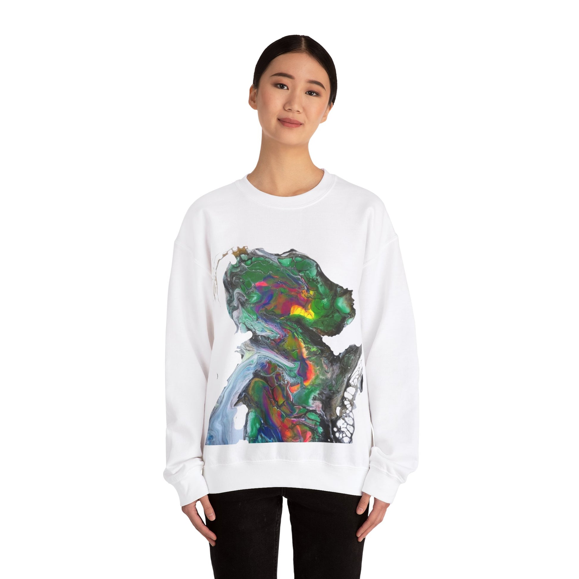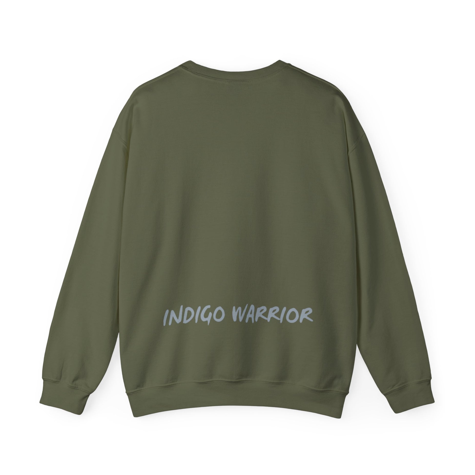 Indigo warrior ‘green alien Warrior print’ pullover. This cozy and durable sweatshirt is perfect for colder months. The classic fit and crew neckline provide a comfortable wearing experience with a clean-cut style. Ideal for those who love unique and bold designs, this sweatshirt is perfect for casual outings or lounging at home. Great for sci-fi enthusiasts and those looking to make a statement with their clothing. Perfect for holiday gifting, sci-fi conventions, and casual wear.