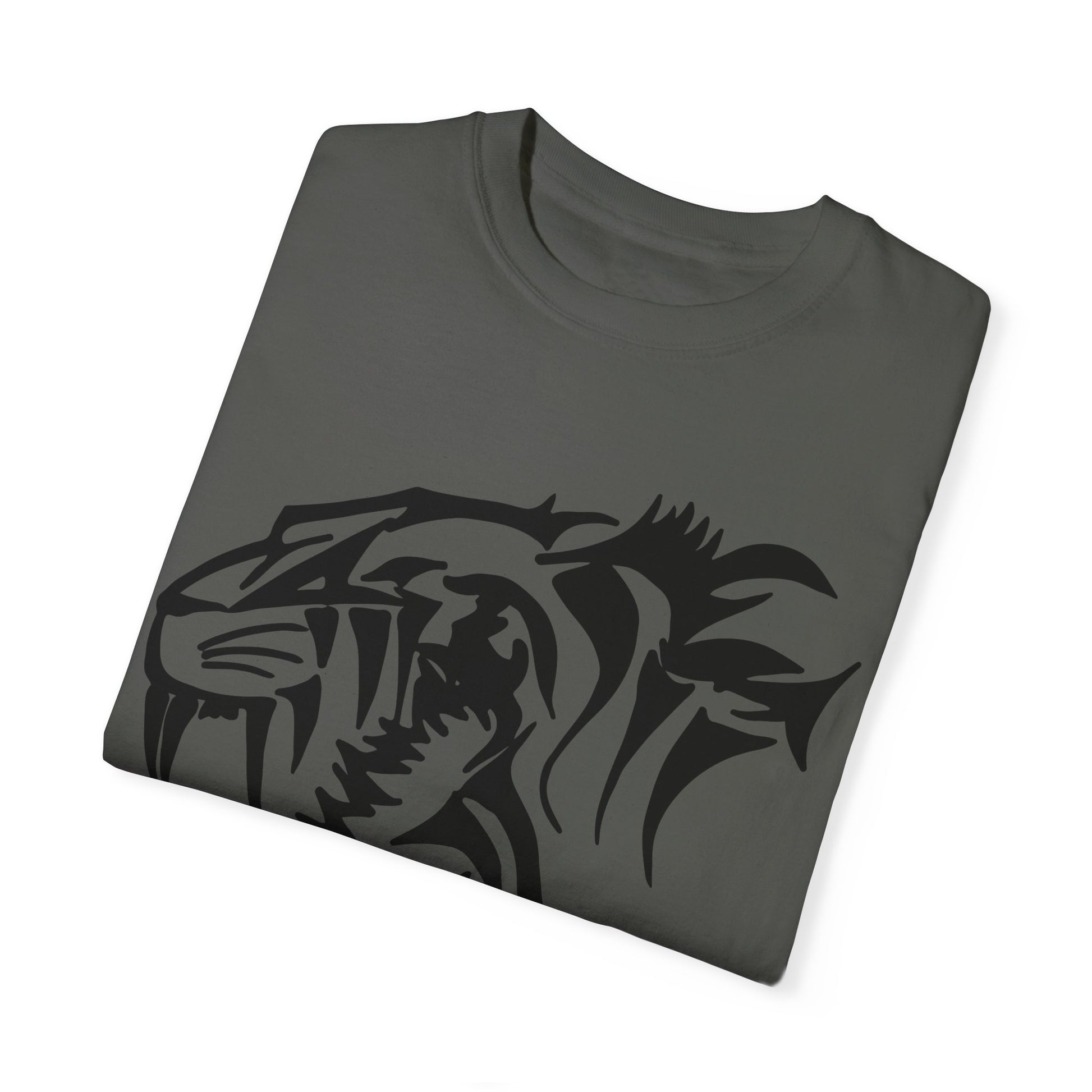 A tribal tiger print t-shirt that exudes a bold and fierce vibe, perfect for casual wear or to make a statement. Ideal for those who love unique and eye-catching designs. Relevant for festivals, concerts, or everyday casual outings.